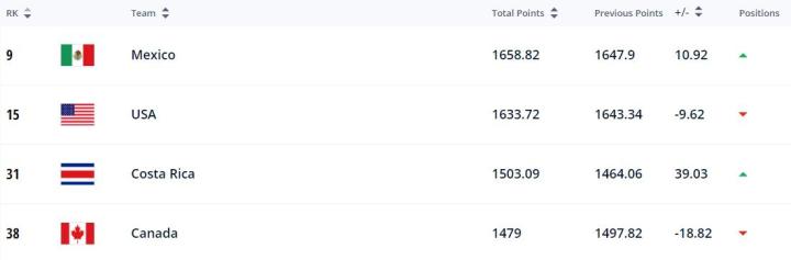 在中北美洲方面,排名前4的球队分别是墨西哥(世界排名第9)、美国(世界排名第15)、哥斯达黎加(世界排名第31)以及加拿大(世界排名第38)。
