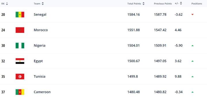 在非洲方面,排名前6的球队分别是塞内加尔(世界排名第20)、摩洛哥(世界排名第24)、尼日利亚(世界排名第30)、埃及(世界排名第32)、突尼斯(世界排名第35)、喀麦隆(世界排名第37)。