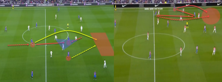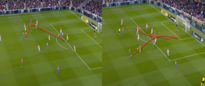 以阿尔巴为例,我们都知道他是一个侵略性的边后卫,他从内马尔的离开中获益,成为巴萨在左边的主要出口。然而现在,他的移动和行为都与他的队友有关。而托雷斯也是如此。当他向内移动时,它为阿尔巴打开了侧翼的位置,也带走了防守队员,创造了孤立的局面。但更重要的是,因为托雷斯移动到了左边的肋部,它使巴萨在进攻时能够占据球场上所有的五个垂直通道,