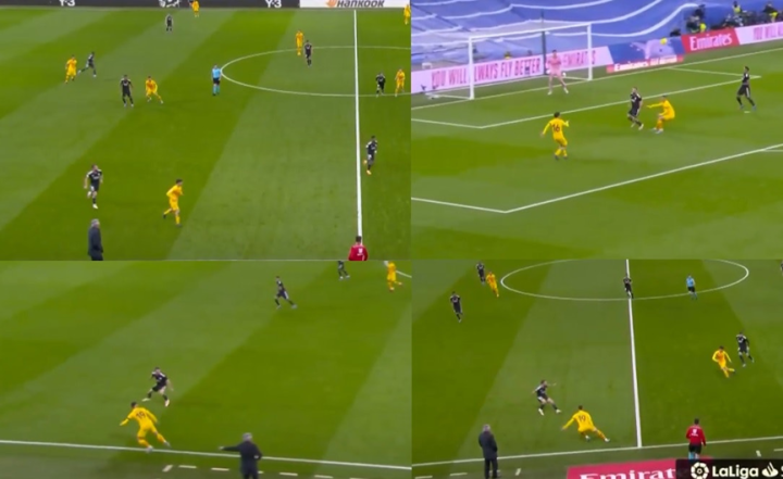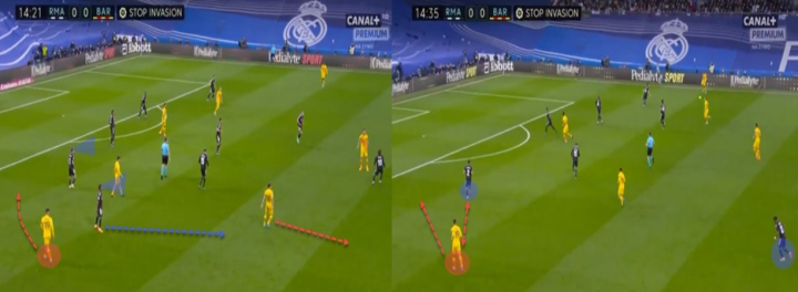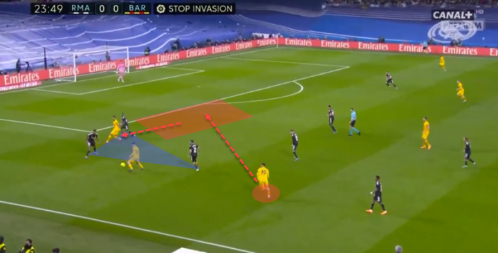 分析这种慢慢溜到防守者盲侧的行动是非常有趣的,他呆在防守者的盲侧,而防守队员甚至没有注意到他正在接近。对阵皇马时也是如此。这种近乎放松的举止让后卫们也放松下来。但这只不过是片刻的安全感。