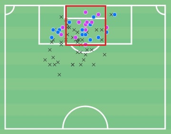 请注意,他的大多数进球(紫色)和射门(蓝色)都来自中路区域,这些区域能够优化进球机会。换句话说,这些位置通常产生高xG或高进球概率值。优秀的前锋往往在正确的时间出现在正确的地点,但这不仅仅是运气的问题,移动就是一个关键方面。