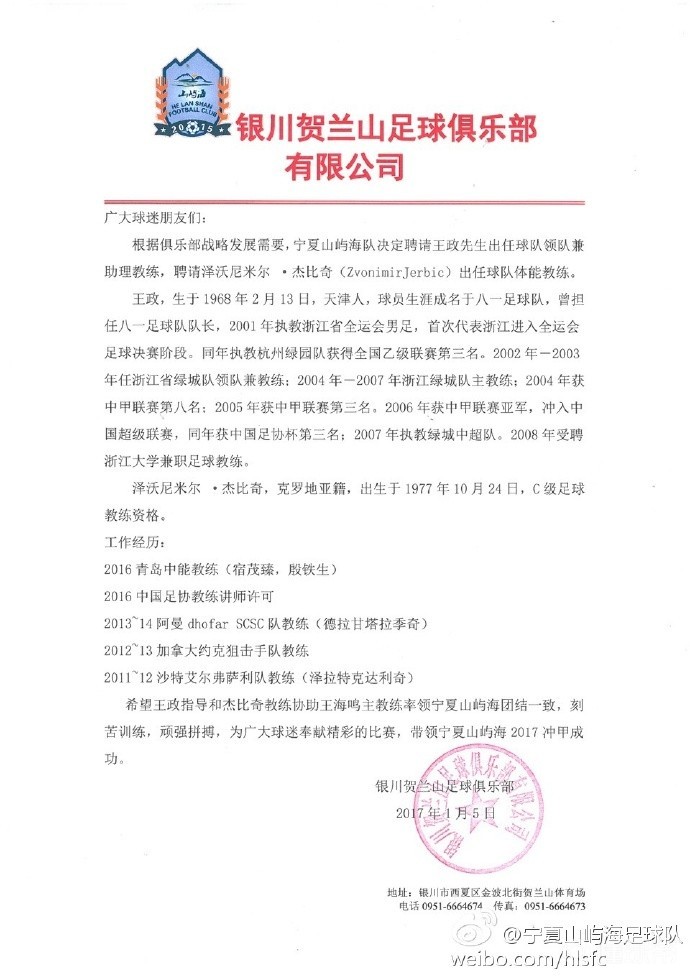 宁夏队官方表示:希望王政指导和杰比奇教练协助王海鸣主教练率领宁夏山屿海团结一致,刻苦训练,顽强拼搏,为广大球迷奉献精彩的比赛,带领宁夏山屿海2017冲甲成功。