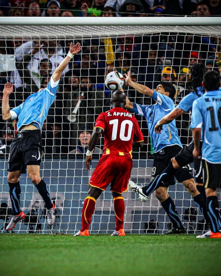 2010年,南非世界杯1/4决赛加时赛最后阶段,苏亚雷斯在门线上,用排球的动作挡出了加纳阿迪亚的必进球,裁判果断判罚红点套餐。然而,面对着绝杀点球机会的加纳队,前锋吉安错过了队史首次晋级世界杯4强的巅峰时刻。进入点球大战的加纳队,尽管吉安将功补过,第一个罚进点球,但是士气高涨的乌拉圭更胜一筹,最终点球大战淘汰加纳,晋级半决赛。