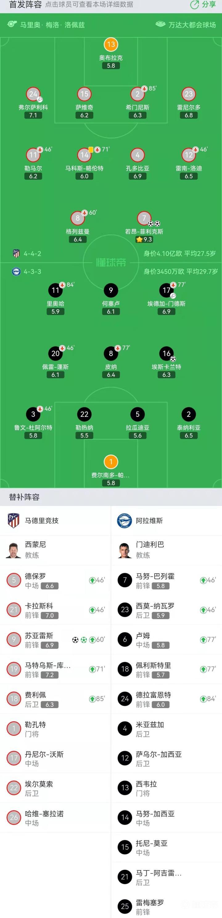 阿拉维斯首发:1-帕切科、3-鲁文-杜阿尔特(46'23-西莫-纳瓦罗)、22-勒热纳、5-拉瓜迪亚、2-泰纳利亚、8-皮纳(77'18-佩利斯特里)、16-埃斯卡兰特、11-里奥哈(84'24-德拉富恩特)、20-佩雷-蓬斯(46'7-马努-巴列霍)、17-埃德加-门德斯(77'6-卢姆)、9-何塞卢