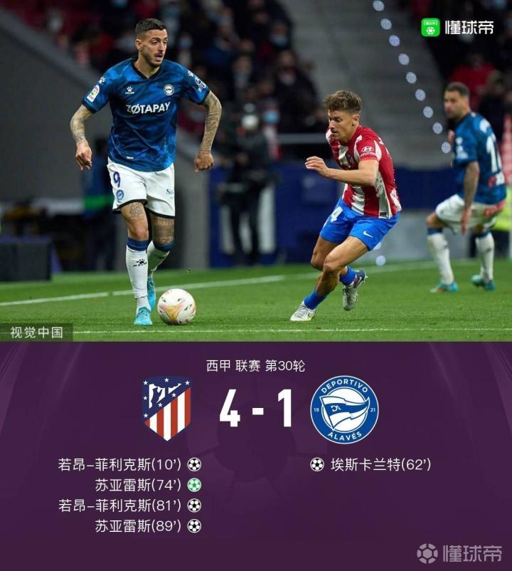 马德里竞技4-1阿拉维斯,苏亚雷斯、菲利克斯双双梅开二度