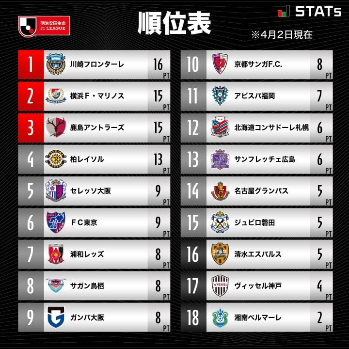北京时间4月2日,2022赛季J1联赛第6轮的较量全部结束。川崎前锋主场1-4不敌大阪樱花,跨赛季联赛主场25轮不败被终结,乾贵士、山田宽人双响;鹿岛鹿角主场2-1逆转清水心跳,联赛四连胜,上田绮世补时绝杀;刚刚换帅的神户胜利船主场1-3不敌京都不死鸟,遭遇开局八轮不胜,跌入降级区;北海道札幌冈萨多主场1-1战平浦和红钻,继续刷新J1开局连续平局纪录。
