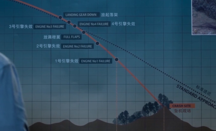21时58分 燃油耗尽,电路失效,飞机客舱灯熄灭,四架引擎停止工作,飞机失去控制开始下降,塔台雷达消失,应答机断电,地面控制塔与飞机失联。
