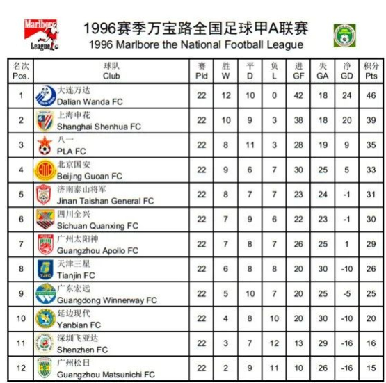 1996年甲A积分榜