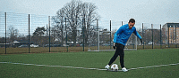 我们要先从牛尾巴开始,然后当我们碰到球的时候,我们要用弱势脚跳起,向内触球就像下面这样。