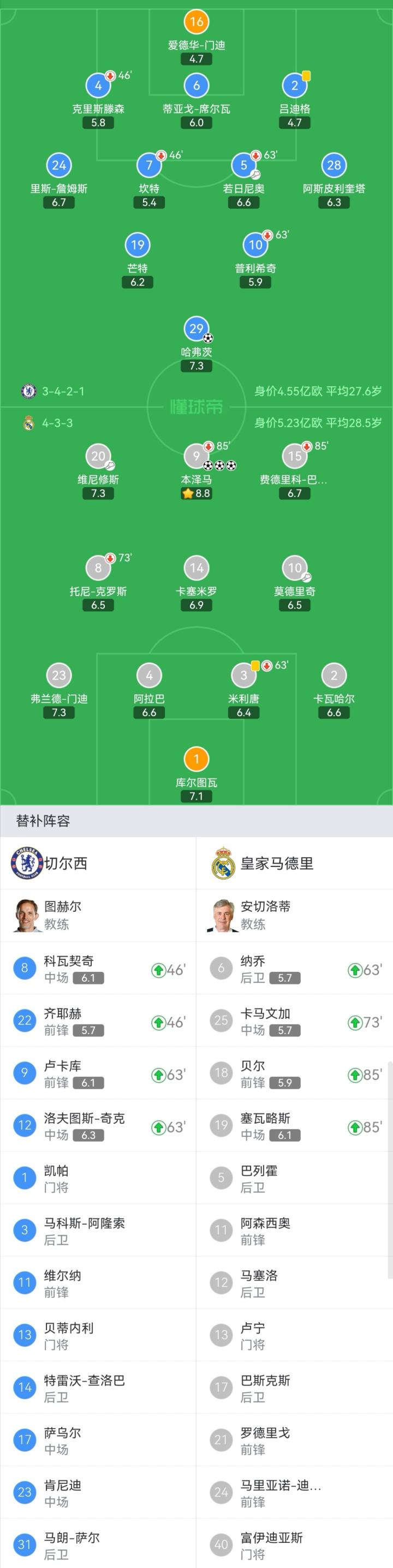 皇家马德里首发:1-库尔图瓦、2-卡瓦哈尔、3-米利唐(64'6-纳乔)、4-阿拉巴、23-弗兰德-门迪、14-卡塞米罗、8-托尼-克罗斯(73'25-卡马文加)、15-费德里科-巴尔韦德(85'19-塞瓦略斯)、10-莫德里奇、20-维尼修斯、9-本泽马(85'18-贝尔)