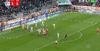 第10分钟,曾特纳停球低级失误后将尼德莱赫纳踢倒,主裁判判罚点球,赫维勒乌操刀一蹴而就,奥格斯堡1-0领先!