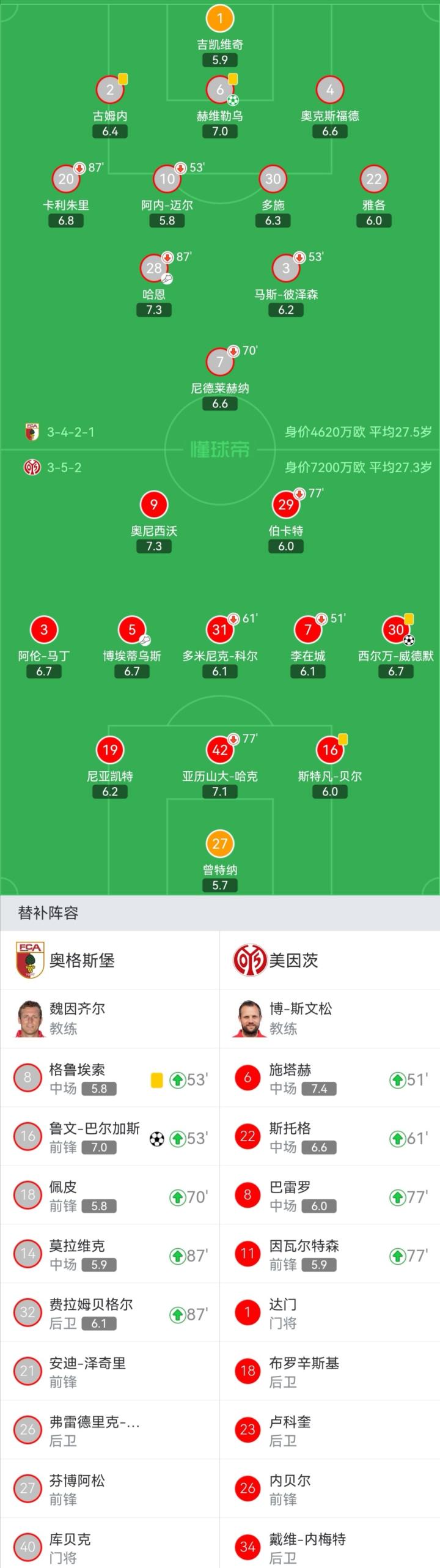 奥格斯堡首发:1-吉凯维奇、2-古姆内、6-赫维勒乌、4-奥克斯福德、22-雅各、20-卡利朱里(87'32-费拉姆贝格尔)、10-阿内-迈尔(53'8-格鲁埃索)、30-多施、3-马斯-彼泽森(53'16-鲁文-巴尔加斯)、28-哈恩(87'14-莫拉维克)、7-尼德莱赫纳(70'18-佩皮)