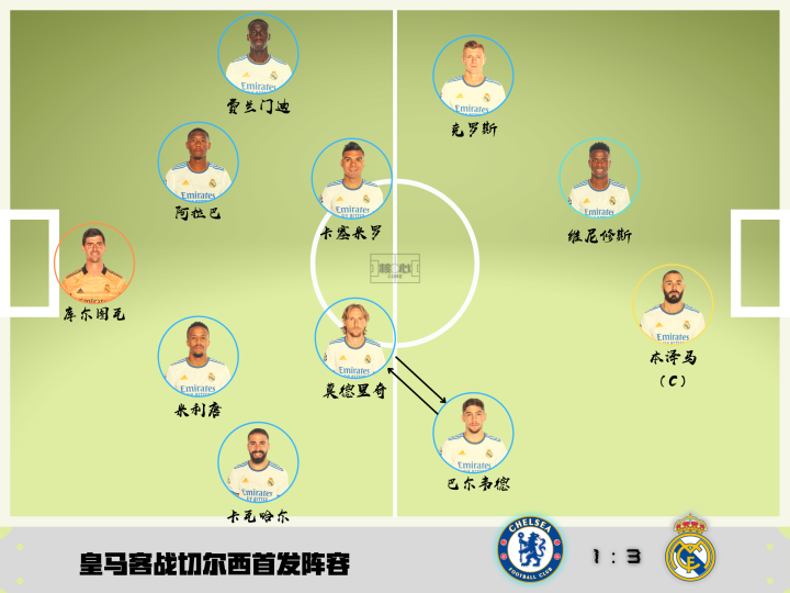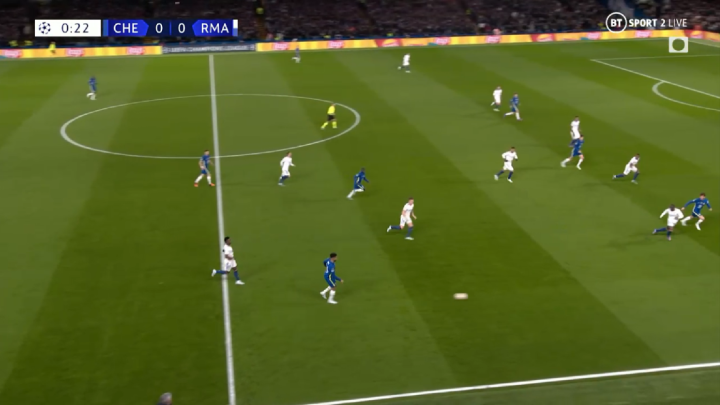 皇马本场的防守阵型其实是5后卫,巴尔韦德会回撤到边后卫位置对切尔西的边翼卫进行盯防,内收的卡瓦哈尔则可以保护肋部,化解切尔西最擅长的肋部前插。