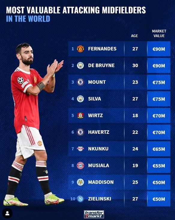 德国知名足球数据网站“转会市场”更新了最新的球员身价,在攻击型中场的身价排名中,曼联中场B-费尔南德斯和曼城中场德布劳内并列以9000万欧的身价排名第一。切尔西年轻中场芒特和曼城中场伯纳德-席尔瓦以7500万欧的身价排名之后。