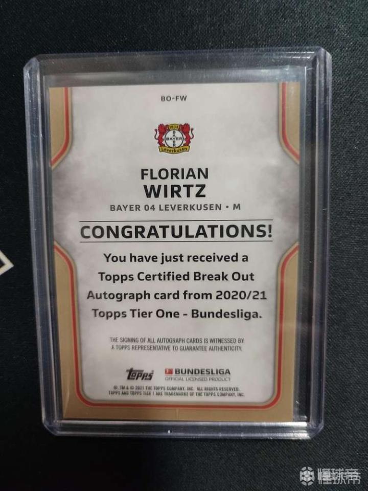 Topps 德甲 Tier one 维尔茨 1/1签字 爆金 one of one 唯一RC签字,这个系列的签字天花板了,系列大结局,顶级大hit,虽然小将维尔茨十字韧带撕裂,但潜力很大18岁已经是俱乐部国家队双料大腿,期待早日伤愈归来!