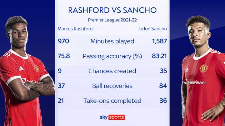 2月对阵南安普顿至今,桑乔各项赛事8场贡献2球3助攻,迎来了红魔生涯的第一个小高潮。同期,拉什福德只收获1次助攻,没有进球。在比赛中,桑乔表现得比拉什福德更为全面。他制造威胁的区域,不止球门前。(注:下文所有数据截止至当地时间4月5日)