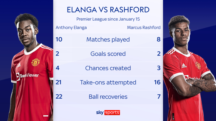 朗尼克一手提拔并加以重用的小将安东尼-埃兰加,已经在一些重要比赛担纲首发。欧冠1/8决赛首回合,拉什福德首发出场74分钟被埃兰加换下,5分钟后,瑞典小将接B费助攻扳平比分。与埃兰加替补登场的立竿见影形成鲜明对比的是,在拉什福德出场的74分钟里,曼联没有一脚射正。