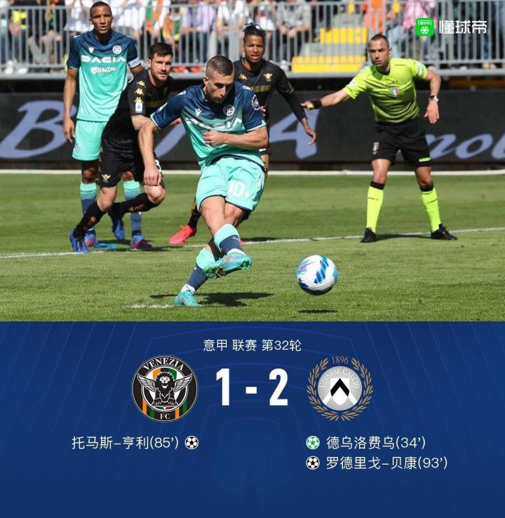 北京时间4月10日21:00,意甲第32轮继续进行,威尼斯坐镇主场迎战乌迪内斯。上半场,德乌洛费乌造点并亲自操刀命中。下半场,托马斯-亨利扳平比分,罗德里戈-贝康完成绝杀。最终,威尼斯主场1-2不敌乌迪内斯,遭遇六连败。