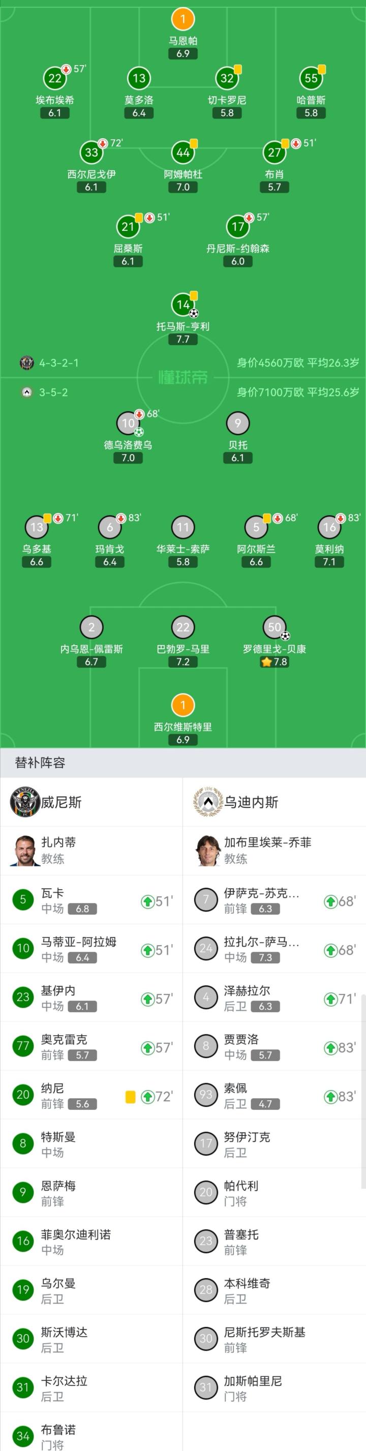 乌迪内斯首发:1-西尔维斯特里、50-罗德里戈-贝康、22-巴勃罗-马里、2-内乌恩-佩雷斯、16-莫利纳(83'93-索佩)、5-阿尔斯兰(68'24-拉扎尔-萨马尔季奇)、11-华莱士-索萨、6-玛肯戈(83'8-贾贾洛)、13-乌多基(71'4-泽赫拉尔)、9-贝托、10-德乌洛费乌(68'7-伊萨克-苏克塞斯)