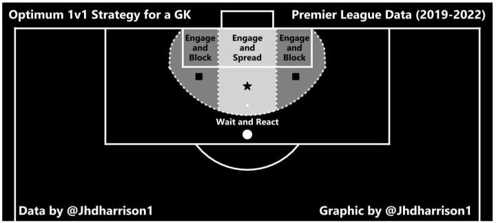 2020年哈里森在推特上公布了他的成果。在球门柱到点球点的中间区域,门将最有可能冲向前锋,将双臂和双腿摆成X形,以这种方式挡出单刀。哈里森称这种姿势为“主动出击并舒展身体”。想象一下,就像拜仁慕尼黑的诺伊尔双腿岔开的样子。