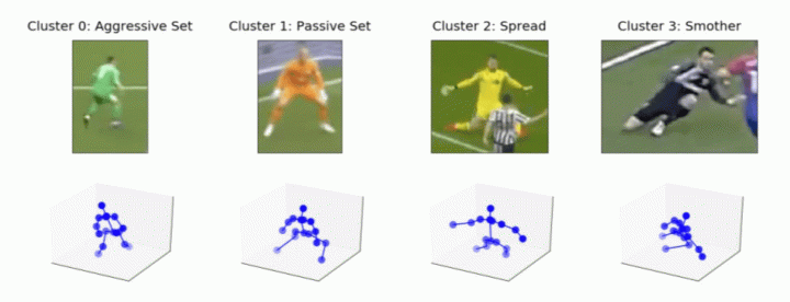 项目的第一步是从StatsBomb事件数据中识别出一对一的射门,然后从视频中剪辑出射门图像。威尔、比尔和其他同事一起,将2018年世界杯、2017-18赛季和2018-19赛季的323次射门影像输入软件,从而捕捉门将四肢和关节的位置。