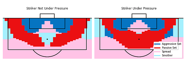 在点球点附近,如果一名后卫紧跟在前锋身后,南安普顿模型的推荐值就会从“封堵型”变为“被动型”。比尔解释道:“如果前锋受到来自背后的压力,他们更有可能选择提前射门。如果他们没有感到压力,则更有可能带球靠近禁区,选择绕过门将。这就是两者之间的区别。”