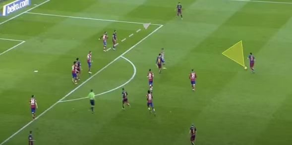如上图所示,巴萨队阵地进攻,后腰布斯克茨拿球抬头观察,当大家都以为布斯克茨会传向自己身体朝向的那名边路已经拉开空间的球员时,但布斯克茨最终并没有选择常规套路。