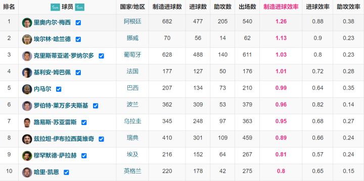 1 梅西,540场477球205助攻,制造682球,制造进球效率1.26
