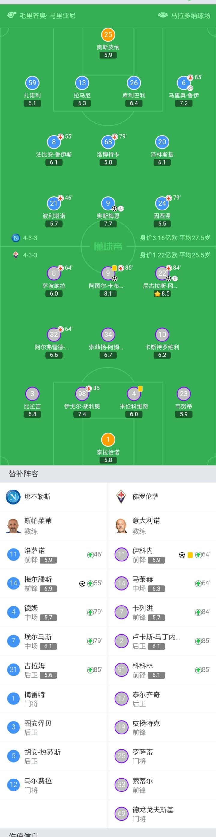 那不勒斯首发:25-奥斯皮纳、59-扎诺利、13-拉马尼、26-库利巴利、6-鲁伊、68-洛博特卡、20-泽林斯基、8-法比安-鲁伊斯、21-波利塔诺、24-因西涅、9-奥斯梅恩