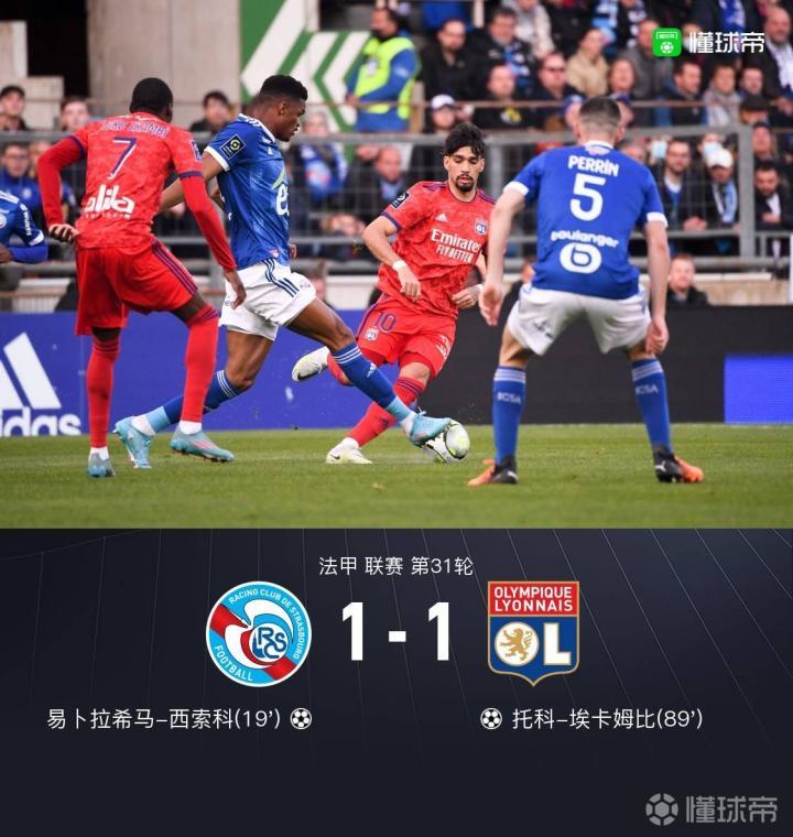 北京时间4月11日1:00,法甲第31轮,斯特拉斯堡坐镇主场迎战里昂。上半场,里昂后卫相互让球,易卜拉希马-西索科抢在门将出击前将球捅进球门。;下半场,89分钟托科-埃卡姆比后点将球扫进球网,帮助里昂绝平对手。最终,斯特拉斯堡1-1里昂。