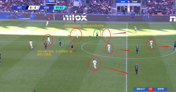 具体到本场比赛,官方给出的维罗纳站位图,是一个3421,但是实际运转起来,更接近一个极端的3331,锋线三叉戟卡普拉里、小西蒙尼和贝萨对位盯防国米的三中卫,14号伊利奇会前提到前腰的位置,盯防布罗佐维奇,而此时中场就只剩下了塔梅泽一个人,作为补充,左边中卫卡萨莱的位置非常灵活,经常会跟着巴雷拉来到对方半场。