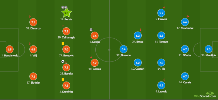 和上周末的“国家德比”相比,此役小因扎吉一共对首发阵容做出了三处调整,华金·科雷亚先发登场,顶替累计黄牌停赛的劳塔罗,德芙赖伤愈复出后首次进入先发,巴斯托尼得到了轮休的机会,小将迪马尔科披挂登场。赛前媒体预测的变阵并没有成真,小因扎吉仍然坚持了352的布阵。