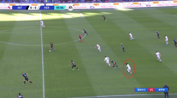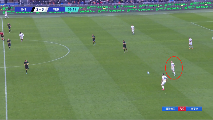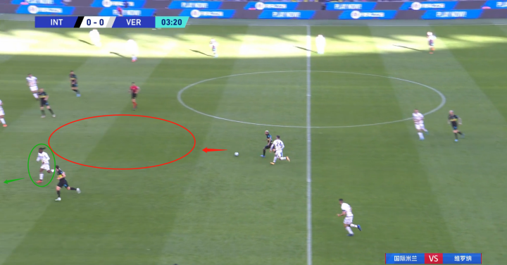 上半场,华金·科雷亚两次绝佳的反击机会,都是来源于塔梅泽的前插,然后维罗纳的传接出现失误,后场短时间内只剩下三名中卫球员,遗憾的是,国米的反击整体缺乏速度,仅仅是依靠科雷亚个体的速度,起不到以点带面的作用。