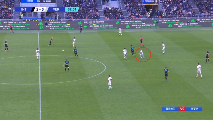 而国际米兰这边,也没有在中后场和维罗纳做太多的纠缠,小因扎吉此役选择避重就轻,没有强行走地面推进,直接在后场起球找科雷亚和哲科两个高点,甚至佩里西奇也成为了前场支点之一,即便争不到,国米也完全可以利用维罗纳中场的空虚,轻松拿到控球权,继续组织进攻。