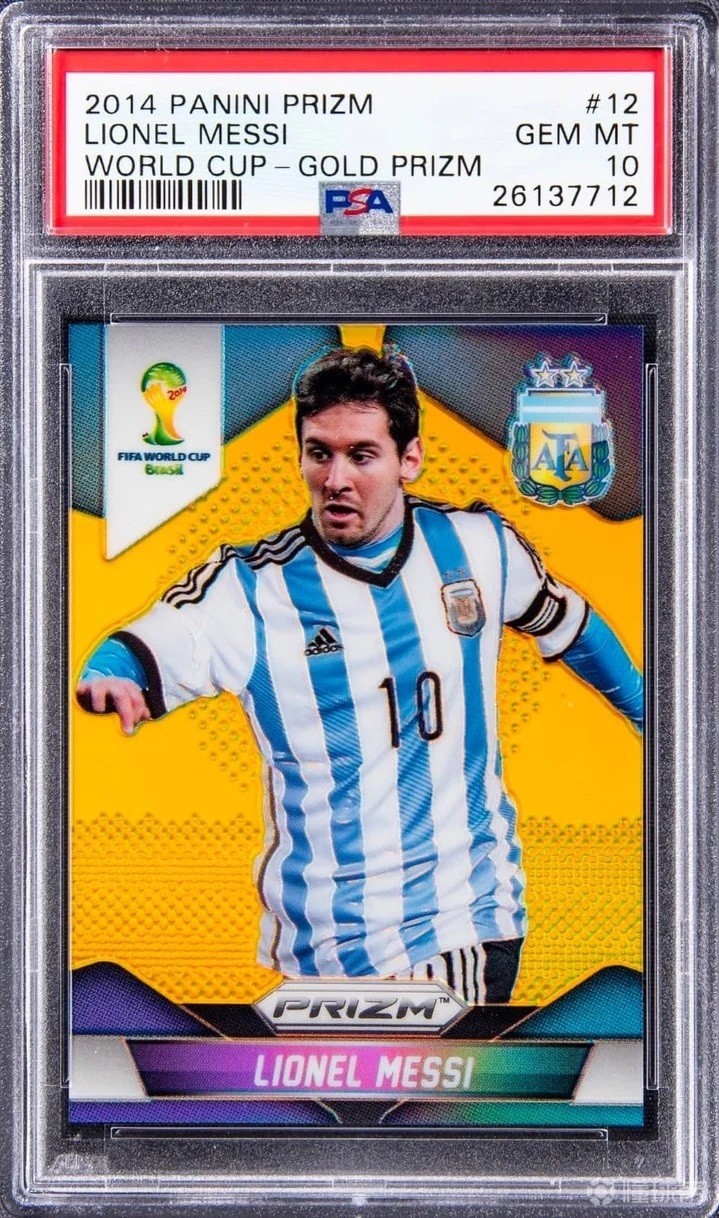 这是帕尼尼公司2013年时为2014年巴西世界杯出品的Prizm系列球星卡。梅西身披阿根廷10号战袍,球星卡主体为金色,全球限量十张(该系列还有限量1张和5张的平行卡),只有2张在市场流通。该卡也被评级公司PSA评为10分卡(品相完美)。