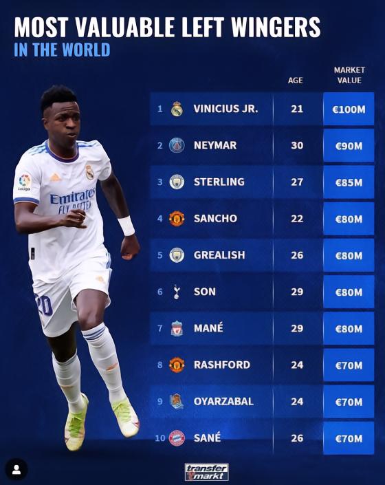 足坛左边锋身价排名:维尼修斯1亿欧第一,内马尔第二