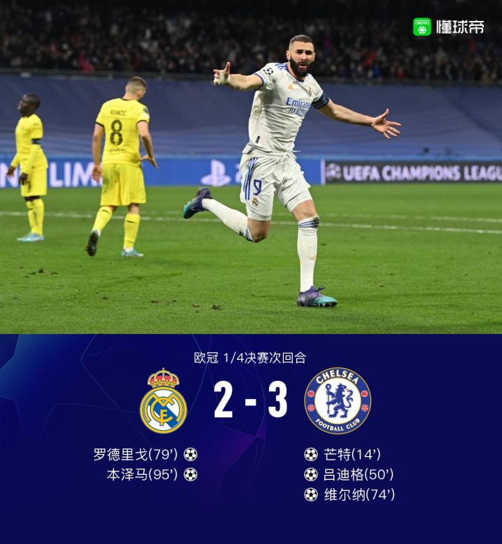 加时赛中,维尼修斯助攻本泽马破门。最终,皇家马德里虽然主场2-3输球,但总比分5-4淘汰切尔西,晋级四强。