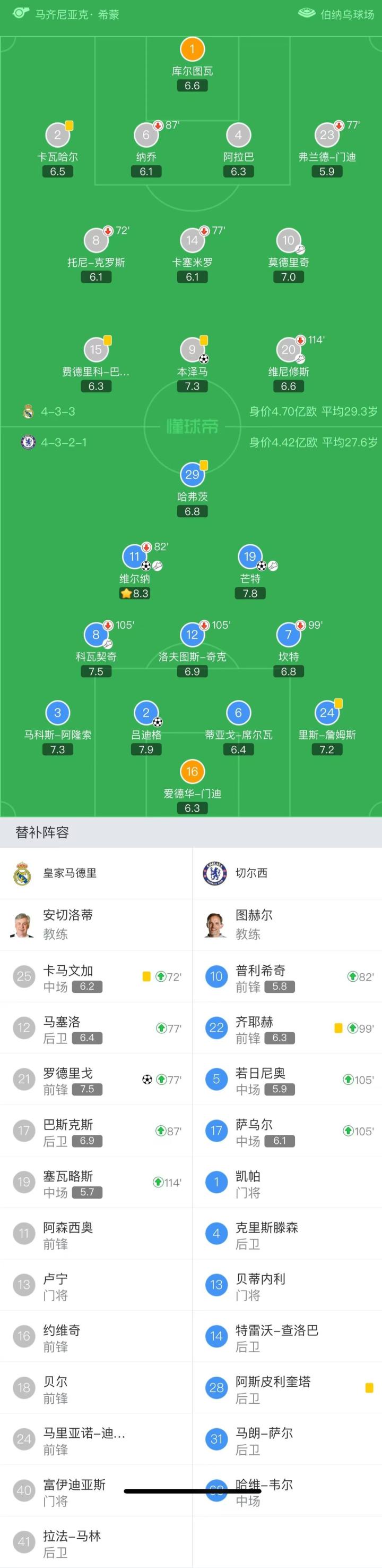 皇家马德里首发:1-库尔图瓦、2-卡瓦哈尔、6-纳乔(88' 17-巴斯克斯)、4-阿拉巴、23-弗兰德-门迪(78' 12-马塞洛)、8-托尼-克罗斯(73' 25-卡马文加)、14-卡塞米罗(78' 21-罗德里戈)、10-莫德里奇、15-费德里科-巴尔韦德、20-维尼修斯(115' 19-塞瓦略斯)、9-本泽马;