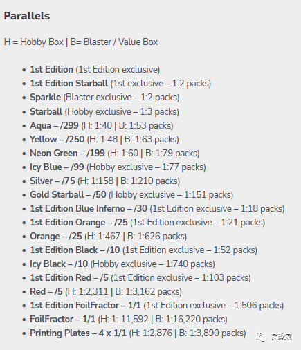 除了Hobby盒的独占折之外,Chrome另外还有14种平行折射,家里有矿又喜欢凑彩虹套的老板们不要错过了,分别还有:银钻折(299编)、紫折(250编)、青折(199编)、粉折(175编)、蓝折(150编)、玫瑰金折(150编)、霓虹绿折(99编)、蓝金欧冠球折(75编)、金折(50编)、黑金欧冠球折(30编)、橙折(25编)、红折(10编)、红波纹折(5编)、Fractor折(1编)
