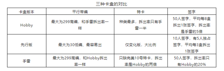 所以,理论上运气正常的人,每盒先行版能保底开出3张带编(有开出4张的情况),平均每3盒能开出1张签字。