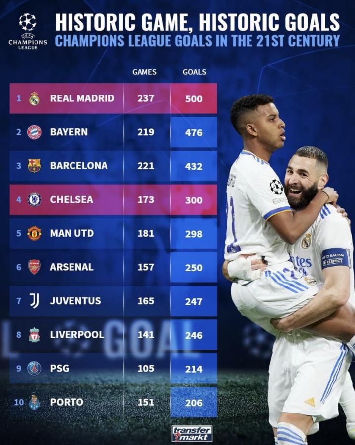 21世纪欧冠进球数:皇马达到500球,切尔西达300球列第四LaPulga @懂球帝2022-04-13 20:08在欧冠1/4决赛次回合后,皇马、切尔西分别完成了里程碑,他们本世纪的欧冠进球数达到了500球和300球。21世纪欧冠进球数1. 皇家马德里 500球2. 拜仁慕尼黑 476球3. 巴塞罗那 432球4. 切尔西 300球5. 曼联 298球6. 阿森纳 250球7. 尤文图斯 247球8. 利物浦 246球9. 巴黎 214球10. 波尔图 206球展开更多