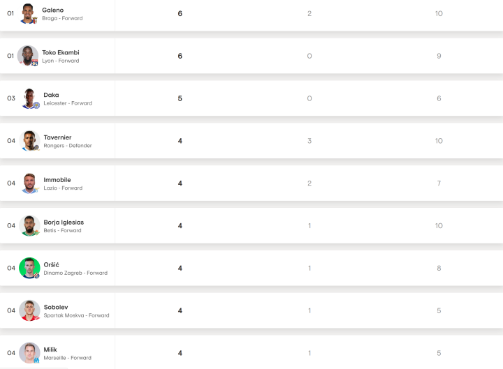 里昂阵中的托科·埃卡姆比仍然以6粒进球并列欧联射手榜榜首。尽管加莱诺也进了6球,但都是在布拉加效力期间打进。后来加莱诺加盟波尔图,在淘汰赛阶段未能取得进球。