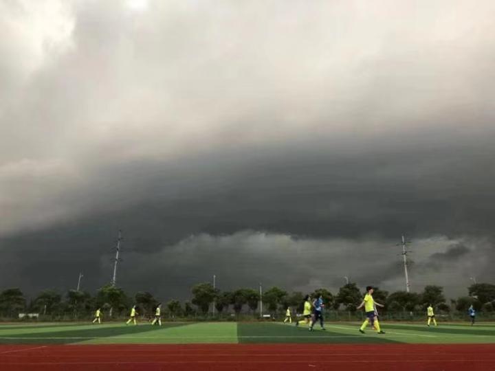 那天,天外是阴沉的,地上是燥闷的,天空从黯淡的灰白色慢慢地要被黑色取代。黑压压的天压得人直喘不过气,仿佛顷刻间就有一盘水哗哗地直接倒下来。这块黑布里,偶然出现了几条蓝色的线,在这样的恶劣的天气下,合肥工业大学与安徽工程大学的一场小组赛开始了。合工大这边先拔头筹,由她们的队长通过一记任意球叩开了对手的大门。天越来越黑了,几声嘭嘭的雷声扰得人们心神不安。
