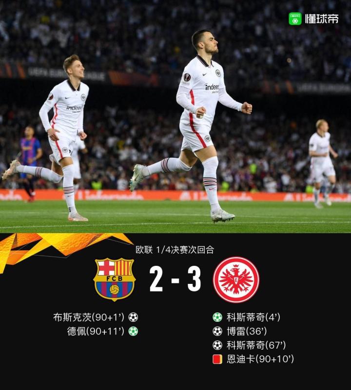 北京时间4月15日03:00,欧联杯1/4决赛次回合,巴塞罗那坐镇主场迎战法兰克福,首回合双方战成1-1平。上半场,埃里克-加西亚开场送点,科斯蒂奇点射闪击后又助攻博雷爆杆世界波建功;佩德里受伤。下半场,奥巴梅扬错失空门,镰田大地助攻科斯蒂奇贴地斩再下一城上演梅开二度;随后布斯克茨进球被吹后铁树开花世界波破门,德佩读秒点射,恩迪卡染红,巴萨补时连扳两城但为时已晚。最终,巴萨主场2-3不敌法兰克福,总比分3-4无缘欧联杯四强。