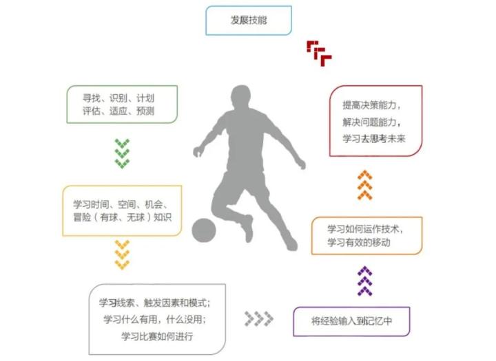 球员学习和掌握足球技术能力是要通过泛化阶段、分化阶段、自动化阶段逐步完成的。在每一个阶段的形成和发展过程中,教练员要不断向球员提供更多的可感知信息,通过有效的重复练习,学习时间、空间、机会、冒险的知识,体验不同的差异,以便于将经验不断输入到记忆中,并通过学习和对比掌握有效决策和解决问题的技能。技术能力的发展,如下图所示。