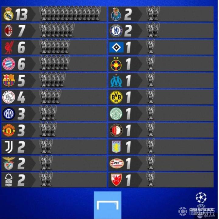 欧冠冠军数量排行榜:皇家马德里:13AC米兰:7...
