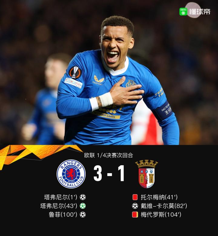 北京时间4月15日3:00,欧联1/4决赛次回合,流浪者主场对阵布拉加。上半场,塔弗尼尔闪击+点射破门,鲁菲头球破门被吹+中框。下半场,鲁菲单刀挑射破门被吹,戴维-卡尔莫头球破门。加时赛鲁菲门前推射破门,梅代罗斯染红,最终,流浪者3-1布拉加,总分3-2晋级。