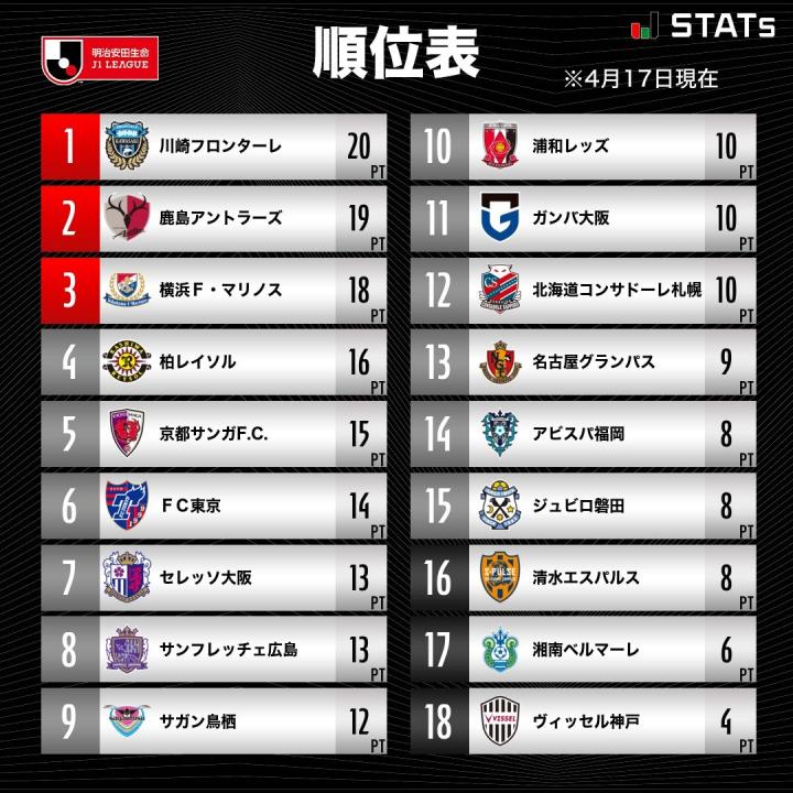北京时间4月17日,2022赛季J1联赛第9轮的比赛全部结束。鹿岛鹿角主场0-0战平名古屋鲸鱼,暂时升至第二,少赛一场落后川崎1分;湘南比马客场1-0绝杀大阪钢巴,拿到本赛季联赛首胜,同时把神户挤到了积分榜末位;磐田喜悦主场2-2绝平广岛三箭,终结了广岛各项赛事四连胜;京都不死鸟客场2-0完胜柏太阳神,联赛两连胜,乌塔卡再度建功。