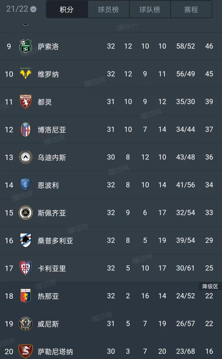 领先18名热那亚11分,领先17名卡利亚里8分。