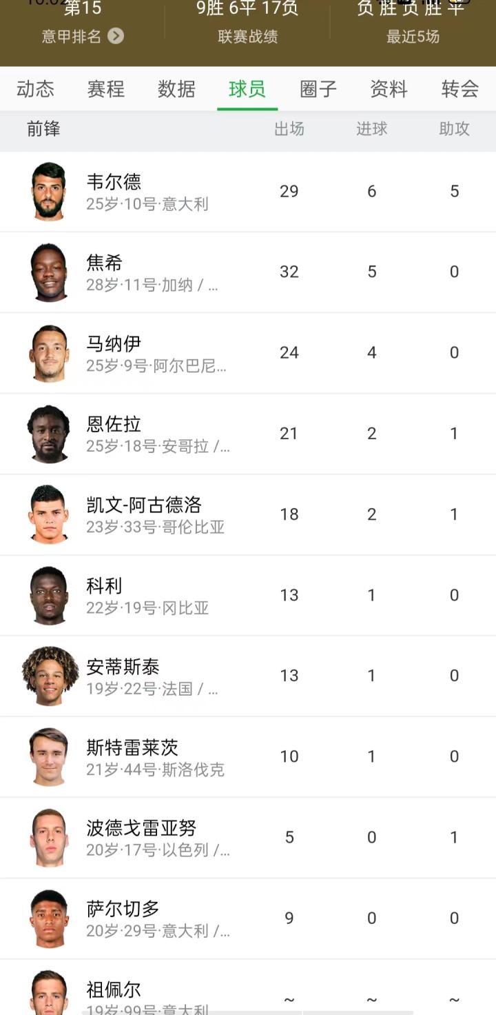 斯佩齐亚目前,32轮,33分。9胜6平17负。胜率29%,进32球,丢54球。